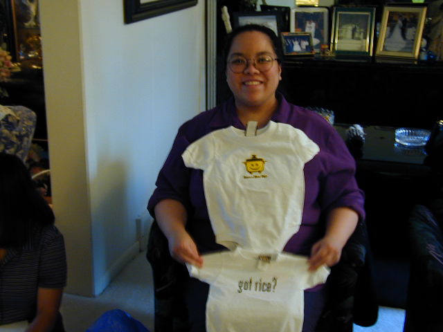 Maria posing with two cute rompers that Godparents Marc and Myra Munoz got